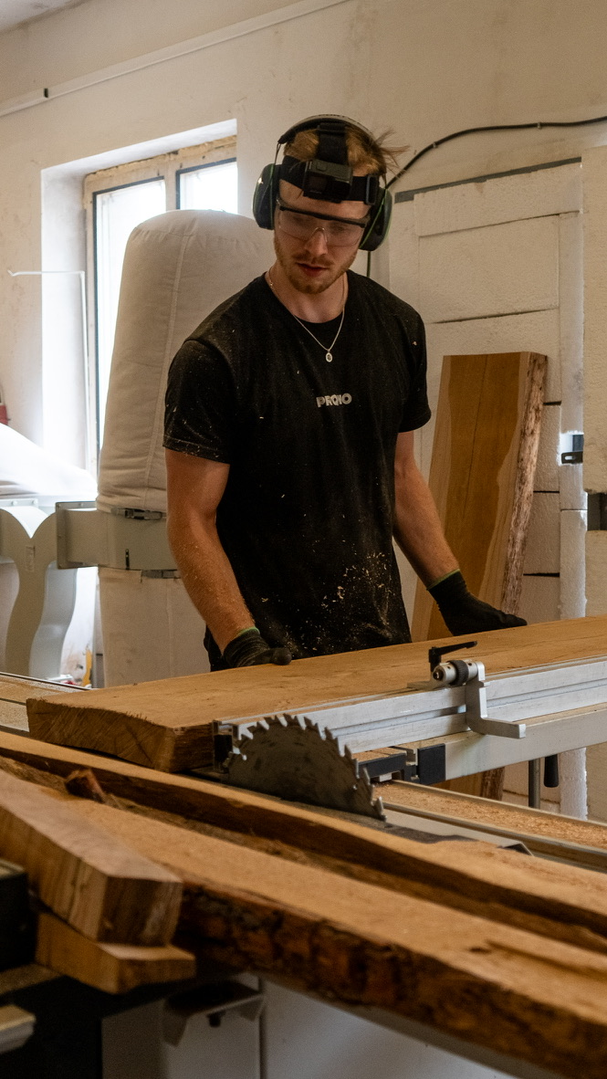 Všechno stojí a padá na materiálu. Prvním krokem je výběr těch správných fošen. Hledáme kusy se zajímavou kresbou, které mají ten správný charakter a kresbu pro budoucí desku. Zakládáme se na lokálnosti. Najdete u nás tedy pouze prvotřídní dřevo z našich krásných českých lesů.