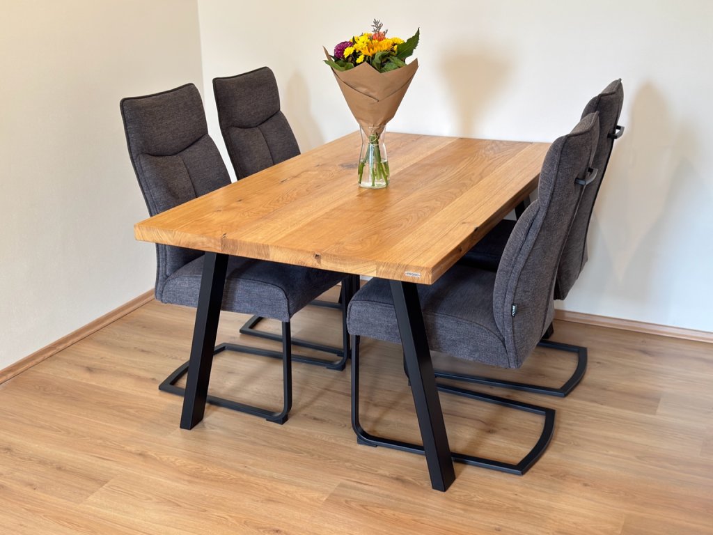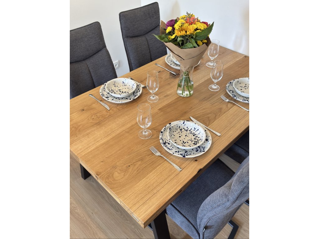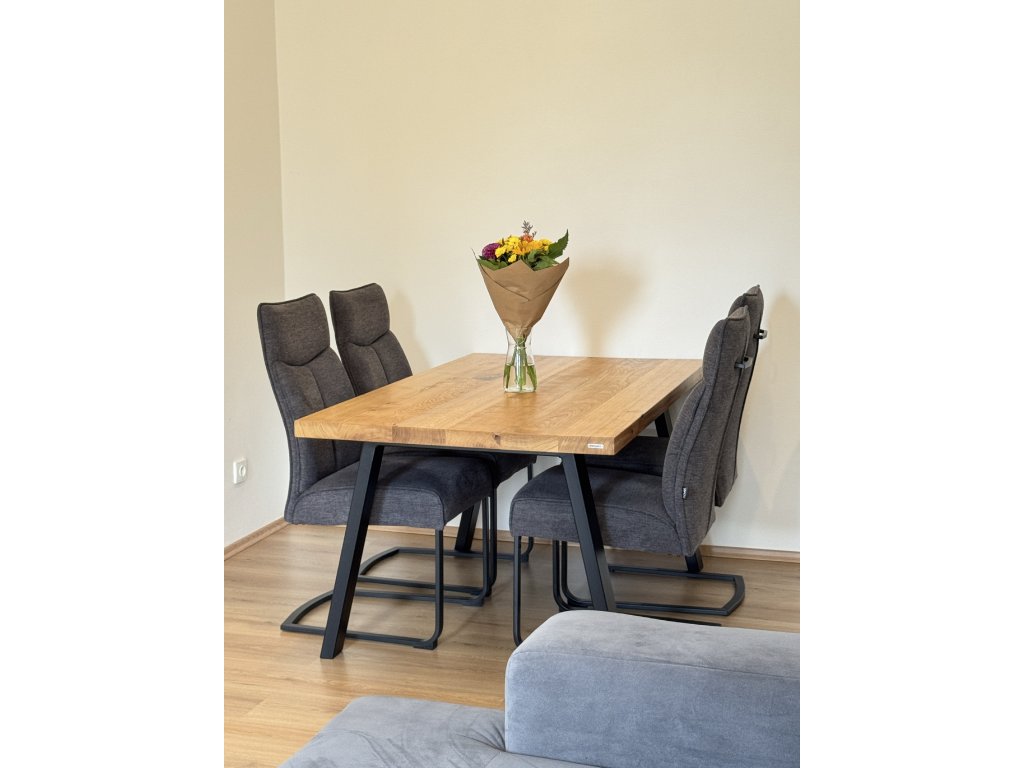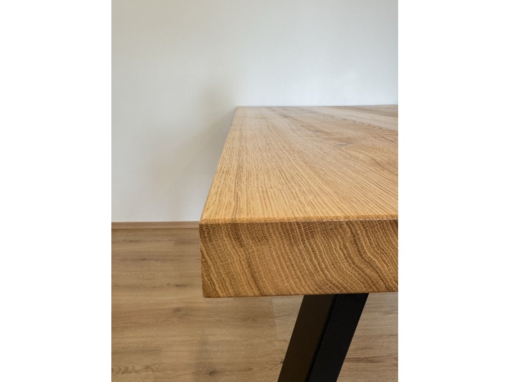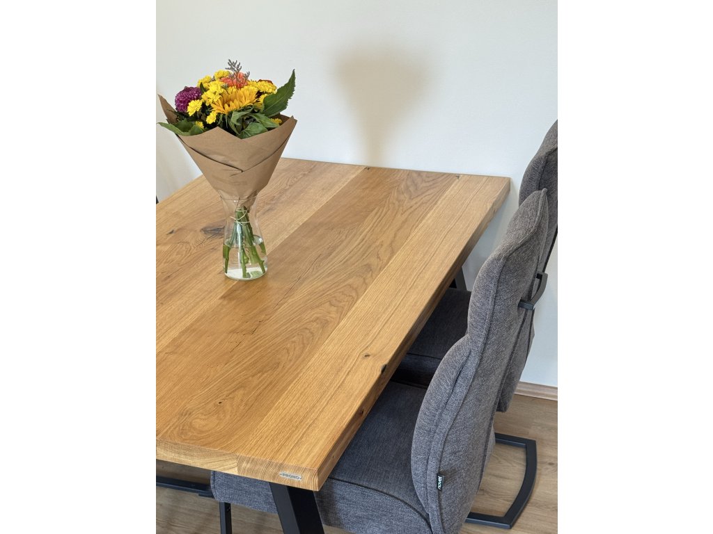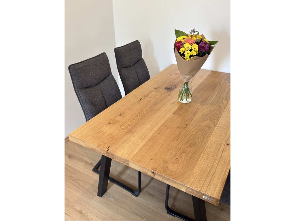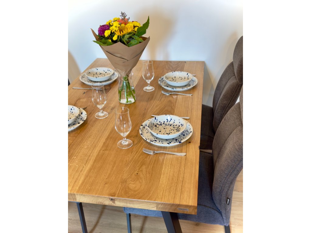 Stolová deska jídelního stolu Aksal je vyrobena z většího počtu pečlivě vybraných masivních dubových fošen, které umožňují vyniknout přirozené kresbě dřeva. Každý kus je ručně zpracován s důrazem na detail a kvalitu.