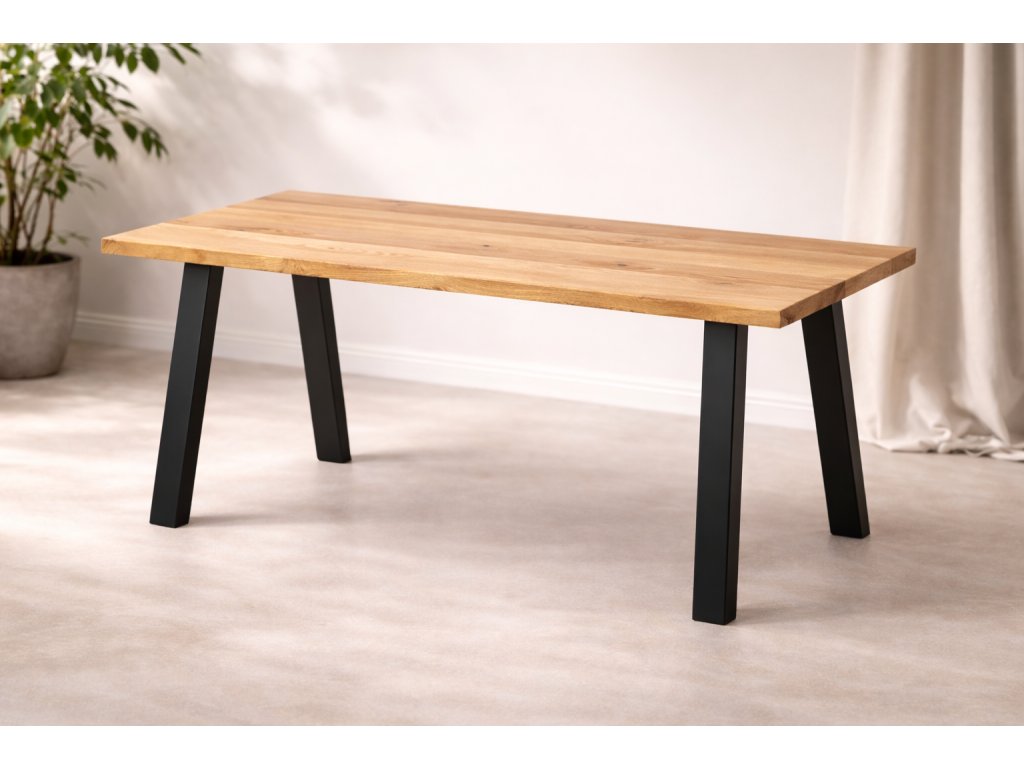 Jídelní stůl s masivní dubovou deskou a ocelovou podnoží do tvaru V