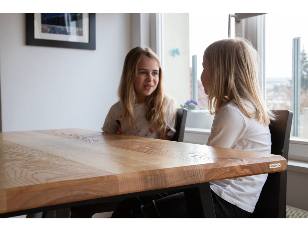 Stolová deska zachovává přirozený charakter masivního dřeva. Suky a drobné prasklinky v ploše desky jsou vyplněny černým tmelem, který zajišťuje stabilitu materiálu a zároveň decentně zvýrazňuje jeho kresbu.