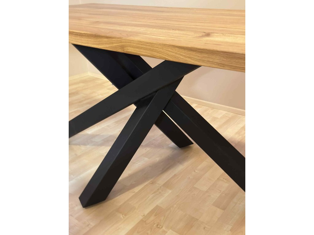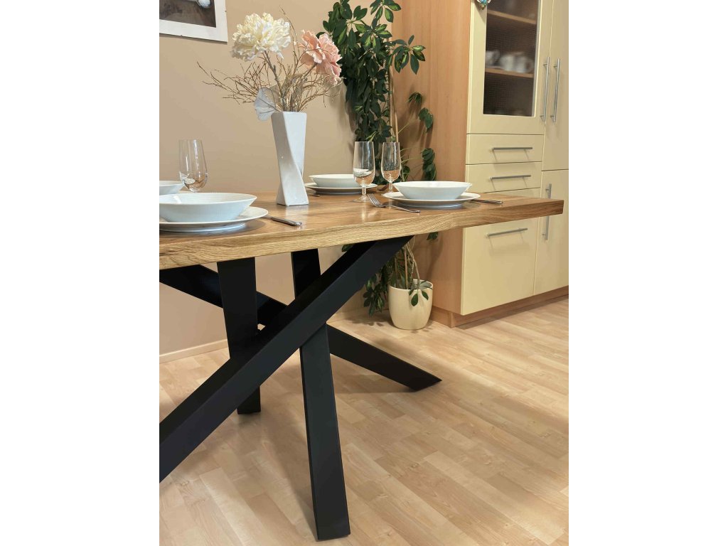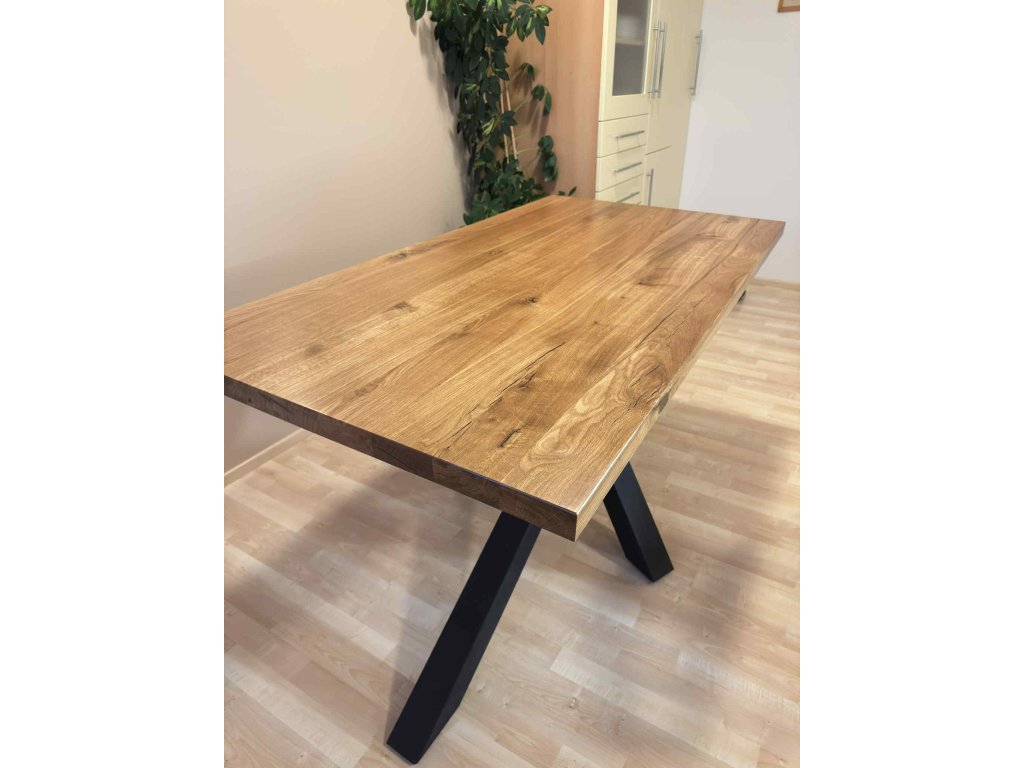 Jídelní stůl s masivní dubovou či jasanovou deskou a elegantní ocelovou podnoží.
