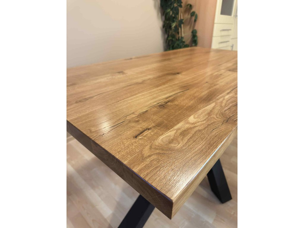 Stolová deska jídelního stolu Pavouq je vyrobena z pečlivě vybraných masivních dubových fošen, které umožňují vyniknout přirozené kresbě dřeva. Každý kus je ručně zpracován s důrazem na detail a kvalitu.