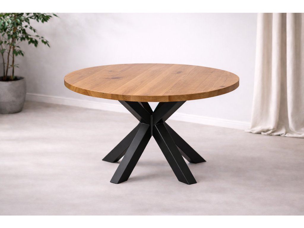 Kulatý jídelní stůl s dubovou deskou a ocelovou podnoží do tvaru X