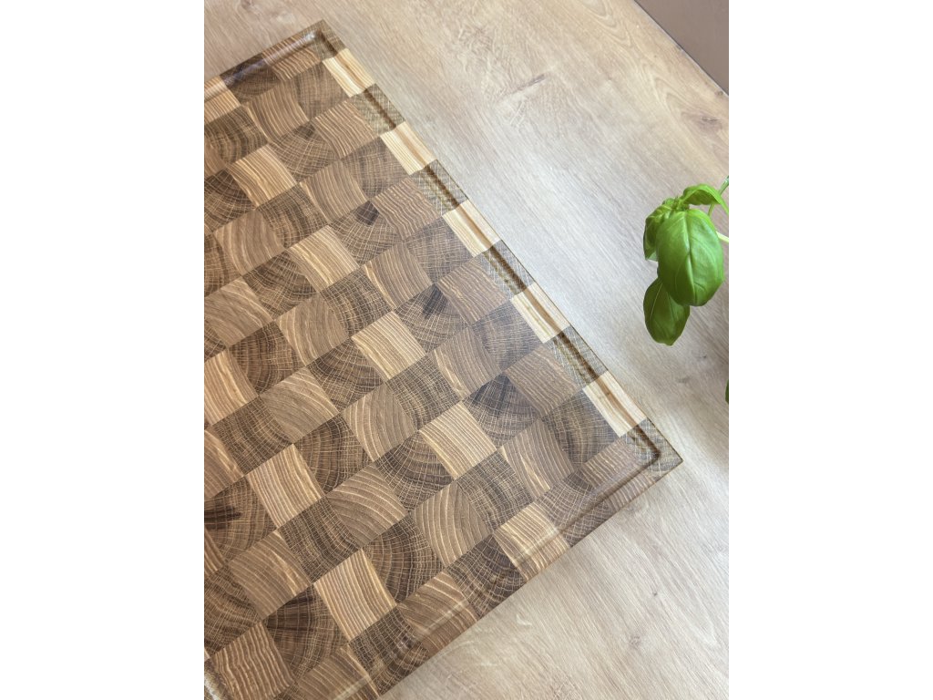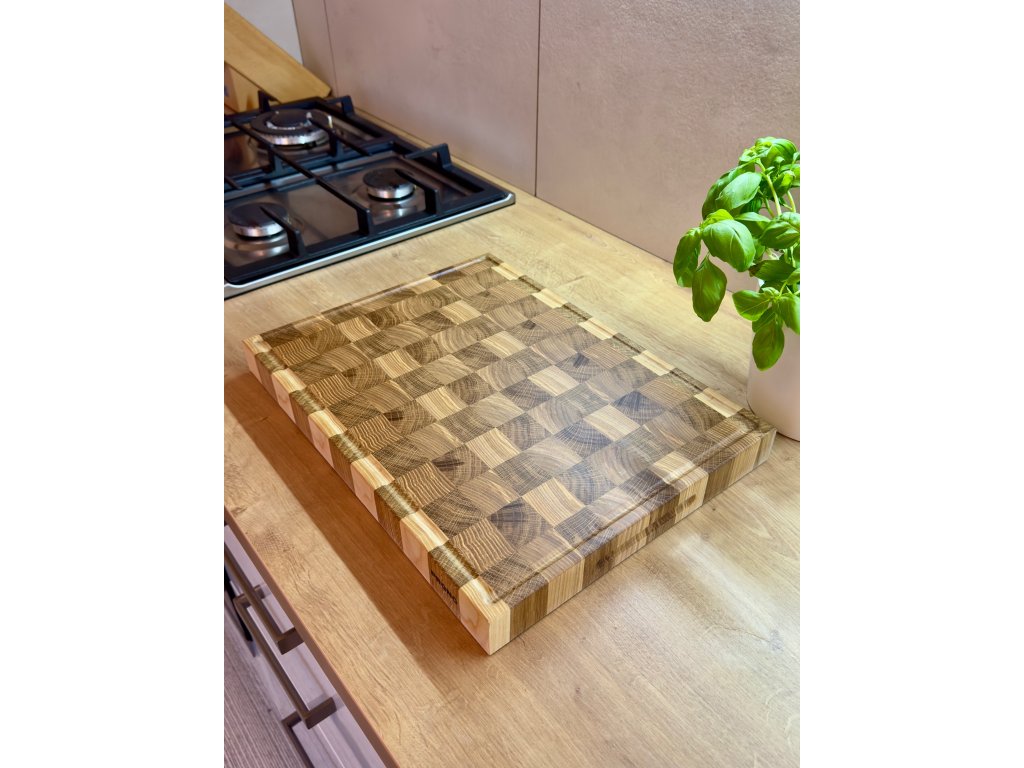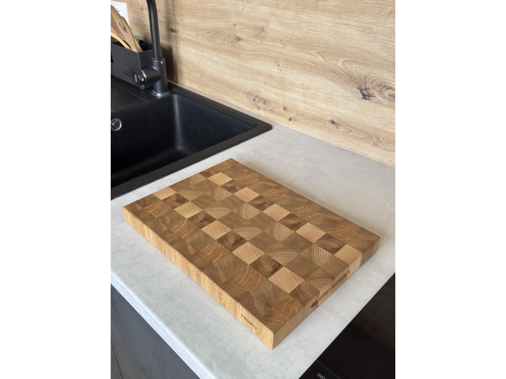 Kuchyňské prkénko SCHACH je kombinace jasanového a dubového dřeva, vyskládaného do vzoru šachovnice.